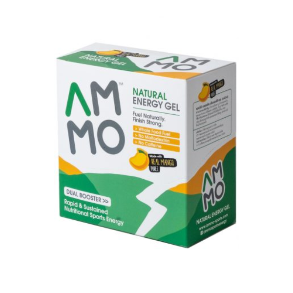AMMO Natural Energy Gel เจลให้พลังงานสำหรับนักกีฬา ใช้วัตถุดิบจากธรรมชาติ อย่างน้ำตาลกล้วยตาก น้ำตาลมะพร้าว ดอกเกลือสมุทร และเมล็ดเจียบด ให้รสชาติอร่อยอย่างเป็นธรรมชาติ ไม่มีรสชาติสังเคราะห์ ด้วยส่วนผสม Dual Action Booster ซึ่งเป็นคาร์โบไฮเดรตสองรูปแบบ ทั้งแบบที่แปลงเป็นพลังงานทันทีและแบบทยอยปล่อยพลังงาน เหมาะสำหรับการออกกำลังกายแบบต่อเนื่อง
