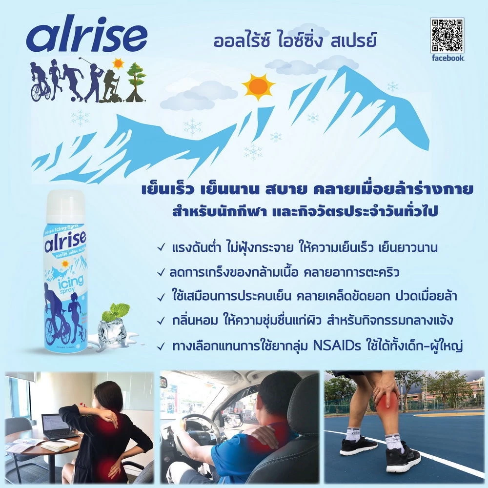 ออลไรซ์ ไอซ์ซิ่ง สเปรย์ สามารถใช้ได้ตั้งแต่ก่อน ในระหว่าง และหลังการออกกำลังกาย การแข่งขันกีฬา การฝึกซ้อม รวมถึงการทำงานในชีวิตประจำวัน เหมาะสำหรับนักกีฬา นักวิ่งมาราธอน นักปั่นจักรยาน นักฟุตบอล นักบาสเก็ตบอล หรือกีฬากลางแจ้งอื่นๆ รวมถึงผู้ที่มีปัญหาปวดเมื่อยล้าร่างกาย อาการออฟฟิสซินโดรม หรือผู้ที่อาศัยหรือทำกิจกรรมในสภาวะอากาศร้อนอบอ้าว