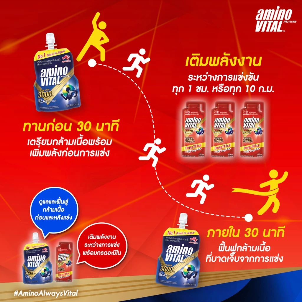 - แนะนำให้รับแระทานทาน aminoVITAL ซองใหญ่ 100 g ก่อนออกกำลังกาย 1 ซองก่อน 30 นาที