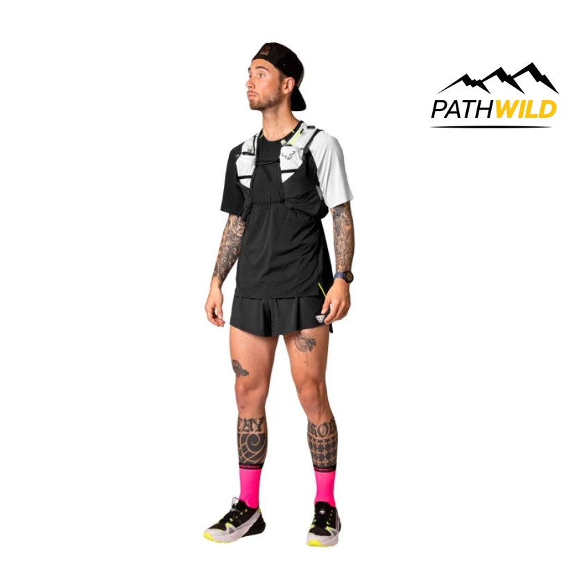 The developers paid special attention to smart and useful features: the flask pockets can be opened with snap closures so athletes and their crew can change bottles in seconds. The annoying bouncing of half-empty thermoses is avoided thanks to two elastic bands that provide stability. To secure the poles, the DNA running vest includes a practical quiver. The large opening allows you to safely store the poles in a snap. The quiver can be placed on the left or right side depending on personal preference. As with all other DYNAFIT running vests, the vest includes three additional elastic bands so that the poles can also be carried vertically in the front, horizontally in the back or in a V-carry system. Vest can be customized to fit your body perfectly using the height and width adjustment straps at the front.
