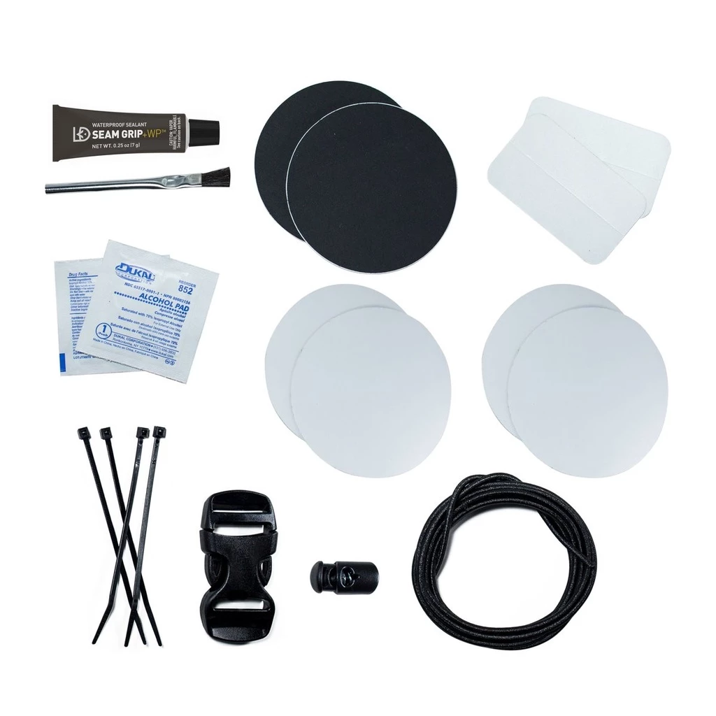 Kit Includes: 6 clear Tenacious Tape patches (3” rounds and 1.5”x2.5”), 2 black nylon Tenacious Tape patches (3” rounds), Seam Grip WP sealant (0.25 oz), applicator brush, alcohol wipes, zip ties, 1” Dual-Adjust Buckle, Ellipse Cord Lock, 80” of Shock Cord, and instructions