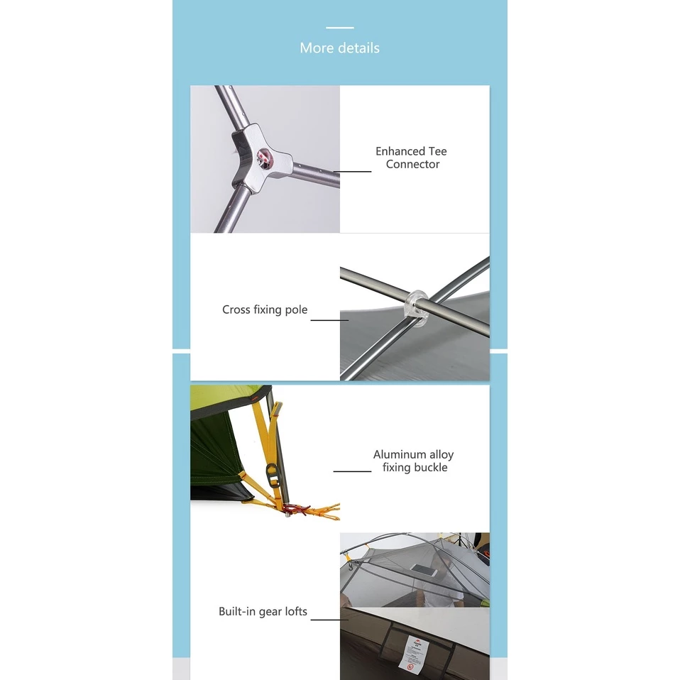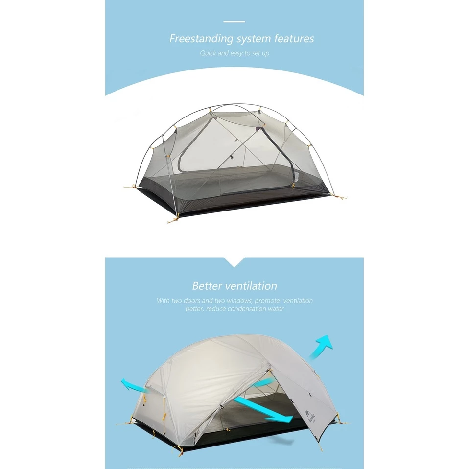 เต็นท์ขนาดกะทัดรัด น้ำหนักเบา ด้วยโครงเสาอลูมิเนียม และผ้าไนล่อน 20 D พื้นที่กว้างเหมือนเต็นท์ทรงโดม ทำให้นั่งในเต็นท์ได้อย่างสบาย มีความโปร่ง ระบายอากาสดี