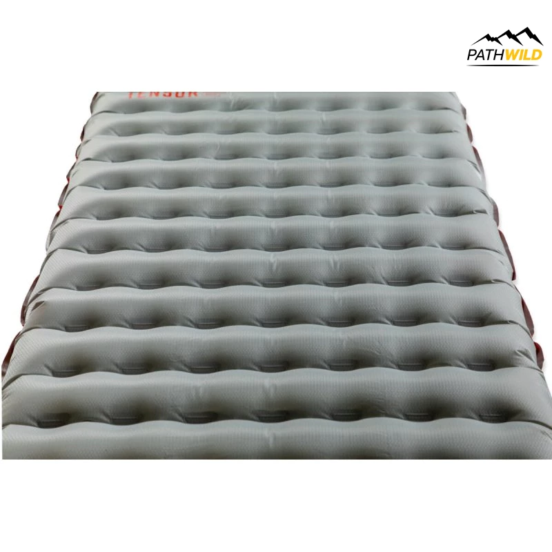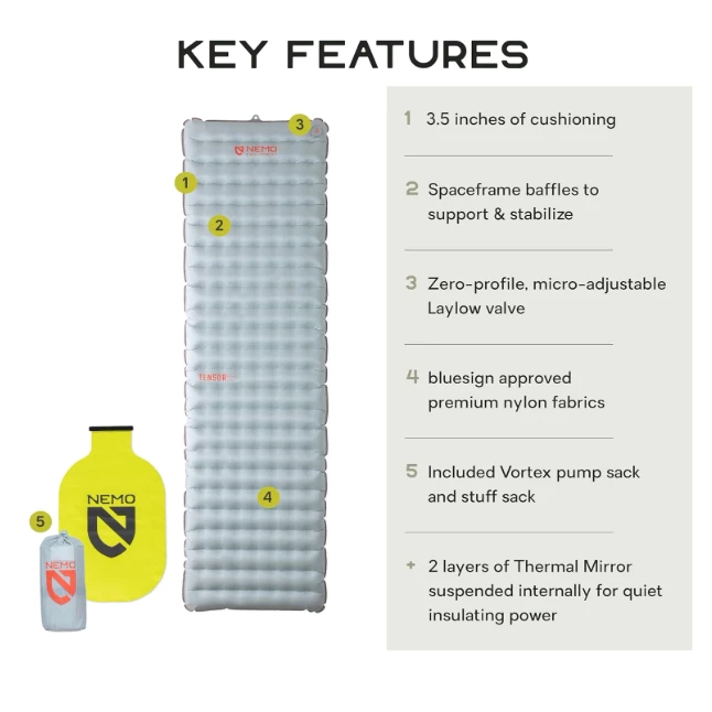 The pad’s interior features NEMO’s proprietary Spaceframe™ baffle design, which utilizes low-stretch fabric trusses to create stable support and offer just the right amount of give — all while avoiding any wobbly waterbed feeling. Inside each baffle are two suspended layers of ultra-thin, metallized Thermal Mirror™ film, which efficiently reflect body heat and contribute to the pad’s overall 5.4 R-value. The layers’ clever floating construction eliminates the crinkling, crunchy sound that many insulated air pads are known for, earning Tensor a reputation for peace and quiet on the trail.