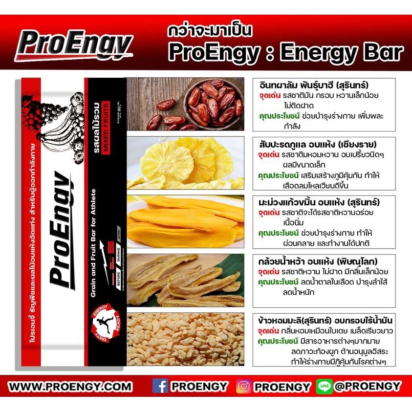 - Ingredients เช่น ถั่วลิสง เม็ดมะม่วงหิมพาน เมล็ดทานตะวัน เมล็ดฟักทอง ข้าวป๊อป จมูกข้าวหอมมะลิ สตอเบอรรี่ กล้วยตาก อินทผาลัม ลูกเกต ลำไย น้ำผึ้งฯ